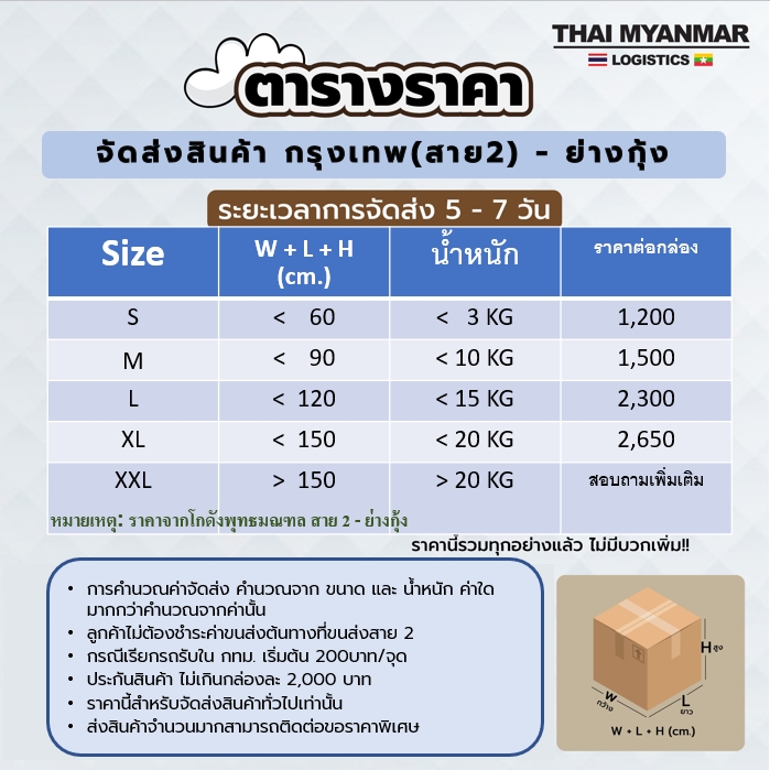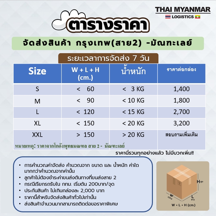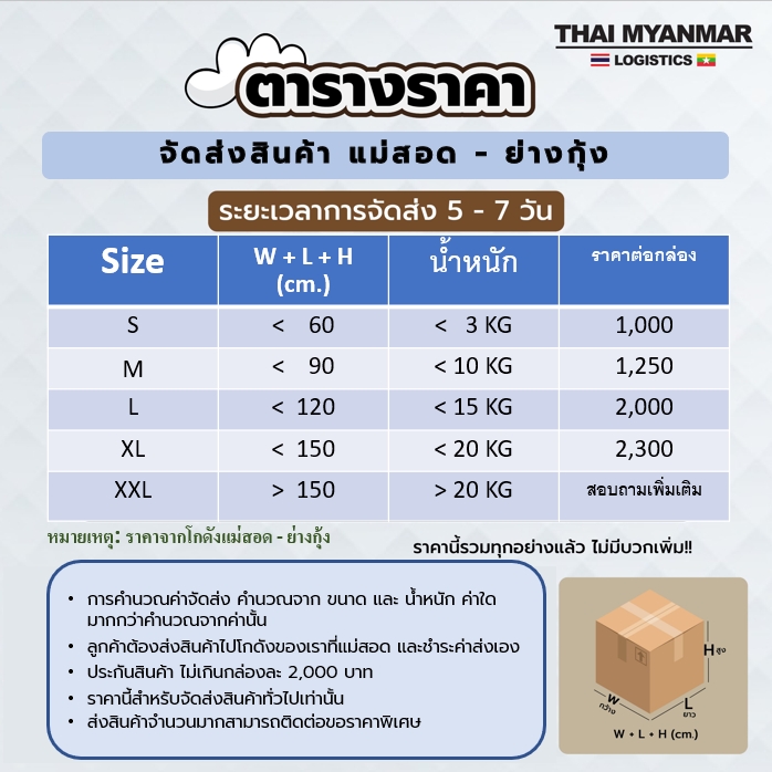 บริการขนส่งสินค้าจากไทยไปพม่าแบบครบวงจร ไม่มีขั้นต่ำ ส่งด่วน 4 วันถึง บริหารงานโดยคนไทยอยู่พม่าตั้งเเต่ 1998 การันตีสินค้าถึงที่หมาย 100%