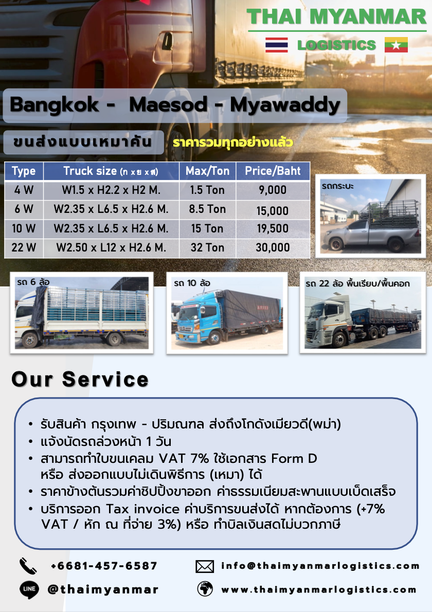 บริการขนส่งสินค้าจากไทยไปพม่า ผ่านชายเเดน เเม่สอด-เมียวดี ครบวงจร ปลีกย่อย เหมาคัน ไม่มีขั้นต่ำ ส่งด่วน 4 วันถึง